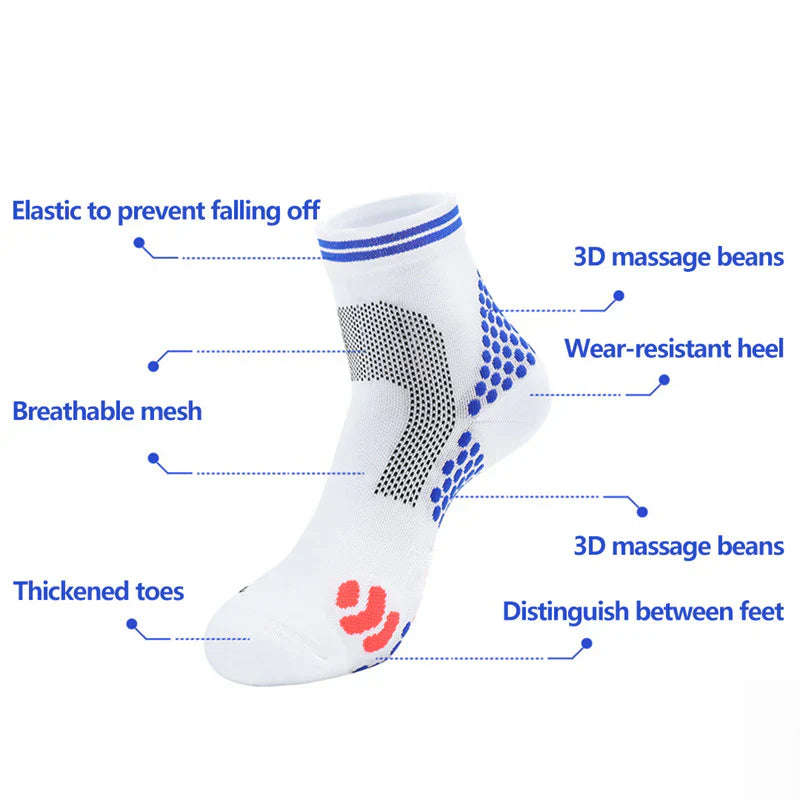 White athletic ankle socks with blue grip patterns, red arch support, and a non-slip red logo on the sole.